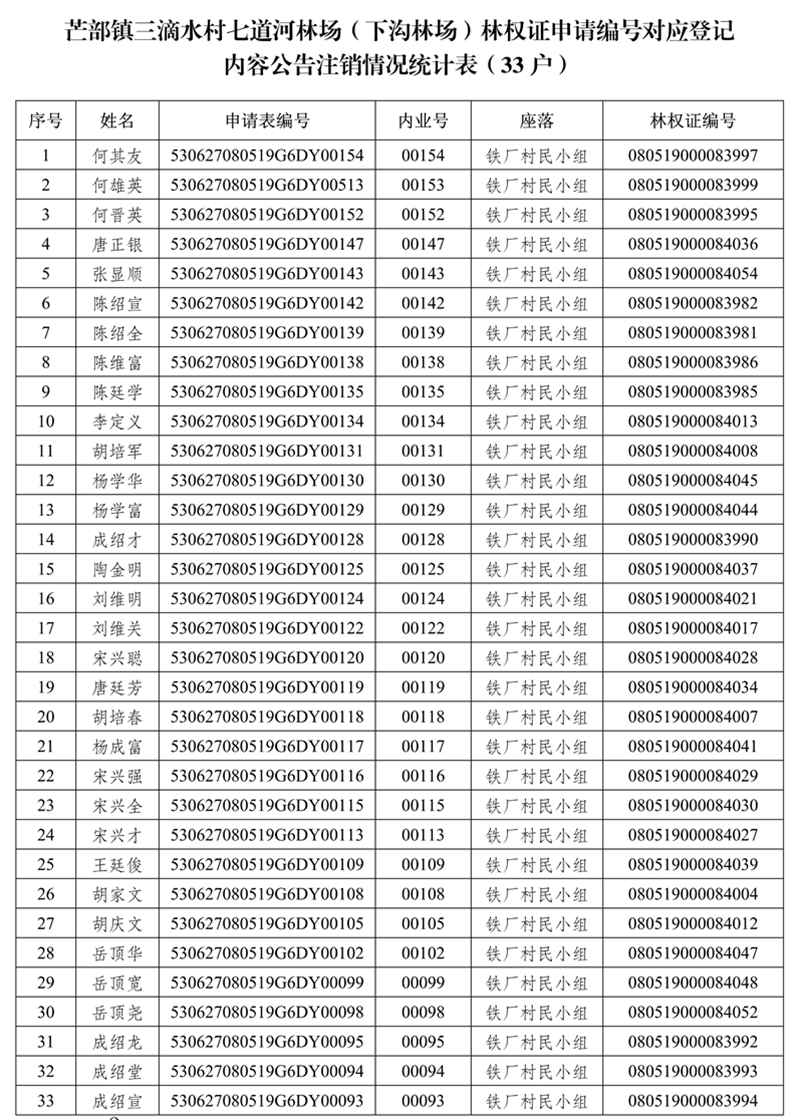 附件:1、芒部鎮(zhèn)三滴水村七道河林場(下溝林場)林權證申請編號對應登記內容公告注銷情況統(tǒng)計表(33戶);