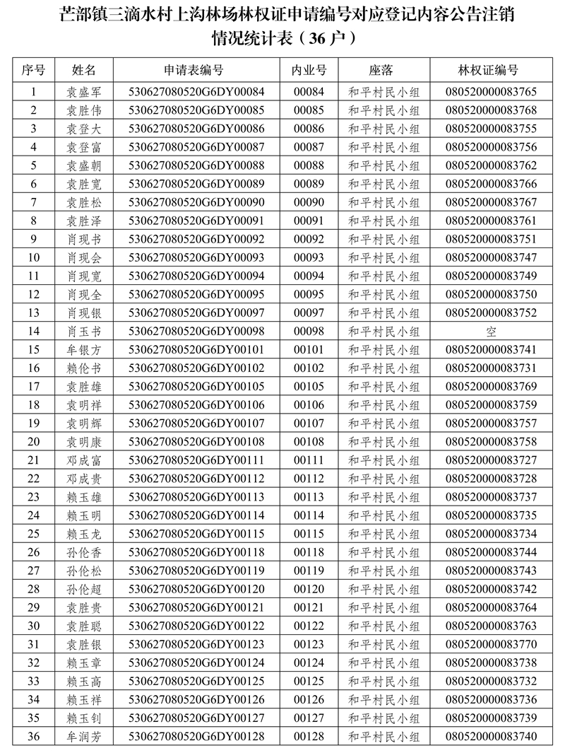 2、芒部鎮(zhèn)三滴水村上溝林場林權證申請編號對應登記內容公告注銷情況統(tǒng)計表(36戶)。