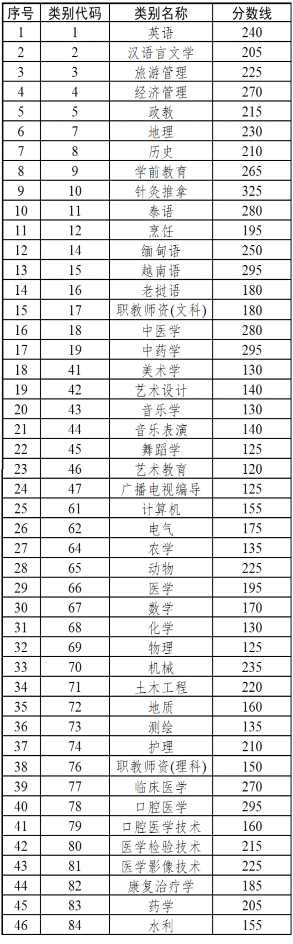 云南省2022年普通高等學校本科招收應屆?飘厴I(yè)生升學統(tǒng)一考試各專業(yè)類別分數(shù)線