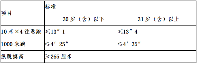 2.體能測試為達(dá)標(biāo)制,并采取一票否決制。達(dá)到規(guī)定項(xiàng)目標(biāo)準(zhǔn)即為合格,否則為不合格,進(jìn)入筆試環(huán)節(jié)。