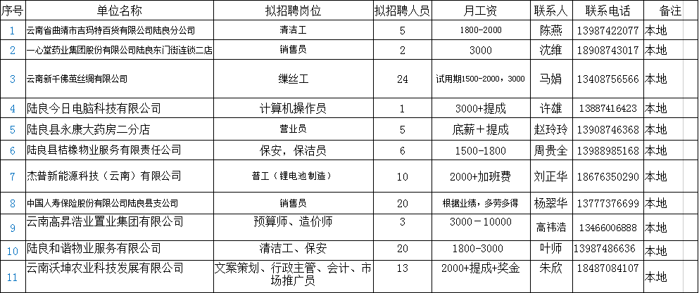 曲靖市陸良縣2020年企業(yè)用工信息發(fā)布