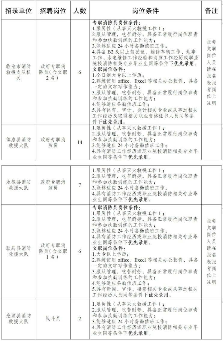 因工作需要,臨滄市消防救援支隊(duì)面向社會(huì)招聘政府專職消防員,現(xiàn)將招聘信息公告如下: