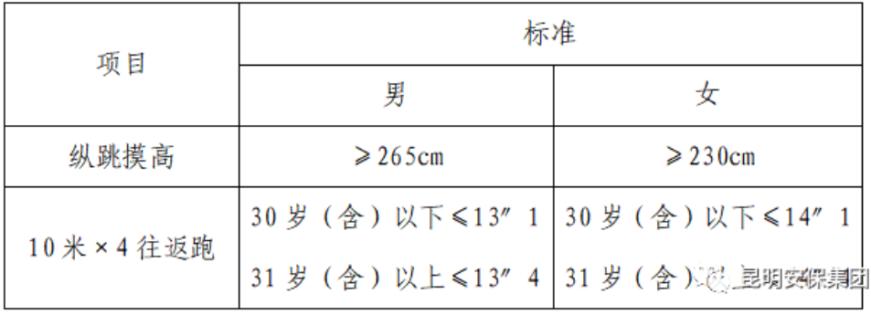 3.縱跳摸高、10米×4往返跑科目采取一票否決制,達到規(guī)定項目標準即為合格,否則為不合格,不合格人員不得參與后續(xù)環(huán)節(jié)的考核,測試標準: