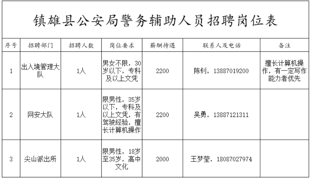 崗位設(shè)置、工資待遇以及其他要求,詳見(jiàn)《鎮(zhèn)雄縣公安局警務(wù)輔助人員招聘崗位表》(附件)。