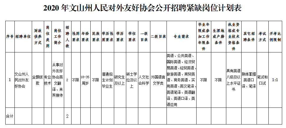 本次招聘崗位為文山州人民對外友好協(xié)會英語翻譯,招聘人數(shù)2人,負責友好協(xié)會具體工作,兼顧外事工作,具體崗位、人數(shù)、資格條件等詳見下表。