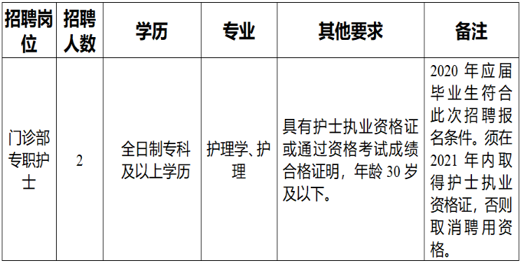 (六) 2020年應(yīng)屆畢業(yè)生符合此次招聘報(bào)名條件,如被聘用,須在2021年內(nèi)取得護(hù)士執(zhí)業(yè)資格證,否則取消聘用資格。