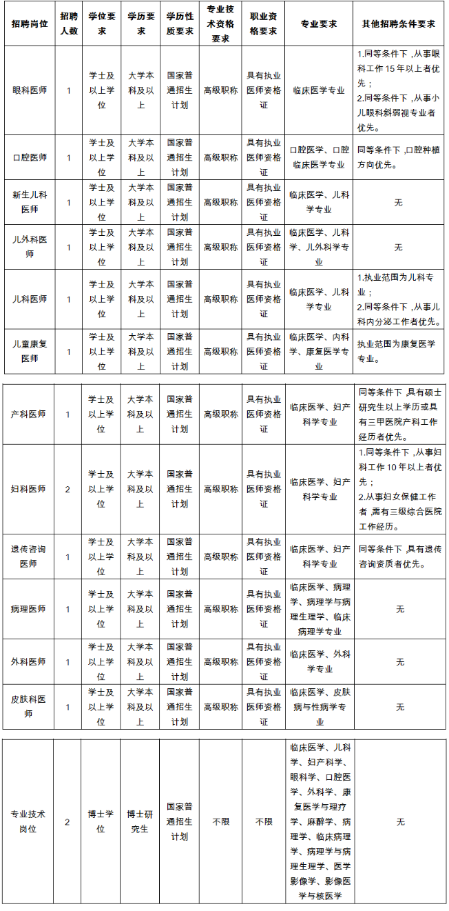 1.副高及以上職稱(新生兒科醫(yī)師、兒外科醫(yī)師、兒科醫(yī)師、兒童康復(fù)醫(yī)師、產(chǎn)科醫(yī)師、婦科醫(yī)師、病理醫(yī)師、外科醫(yī)師、皮膚科醫(yī)師)